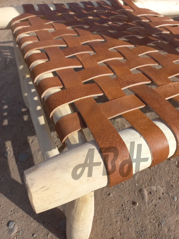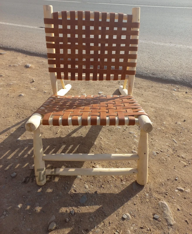 100% Natural Moroccan armchair in wood and nude leather. Item handmade by our Moroccan artisans, Practical in the lobby, to sit in the living room or simply decorative, the woven leather armchair will bring a boho chic atmosphere. Also use it on a terrace.