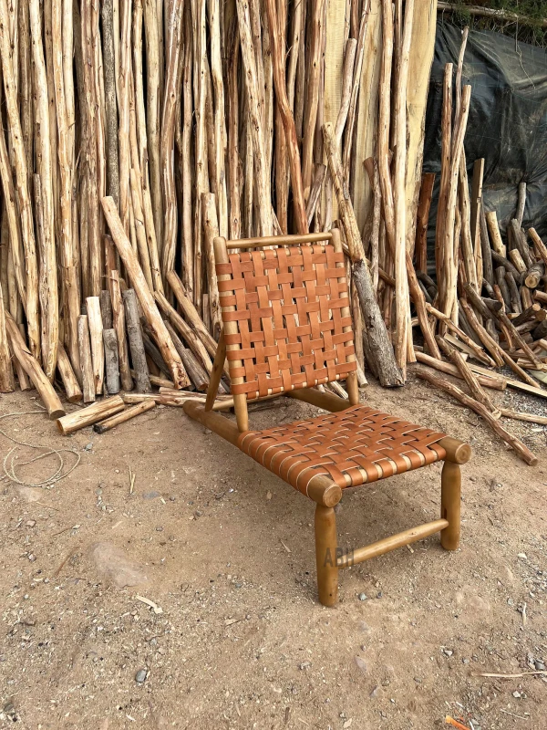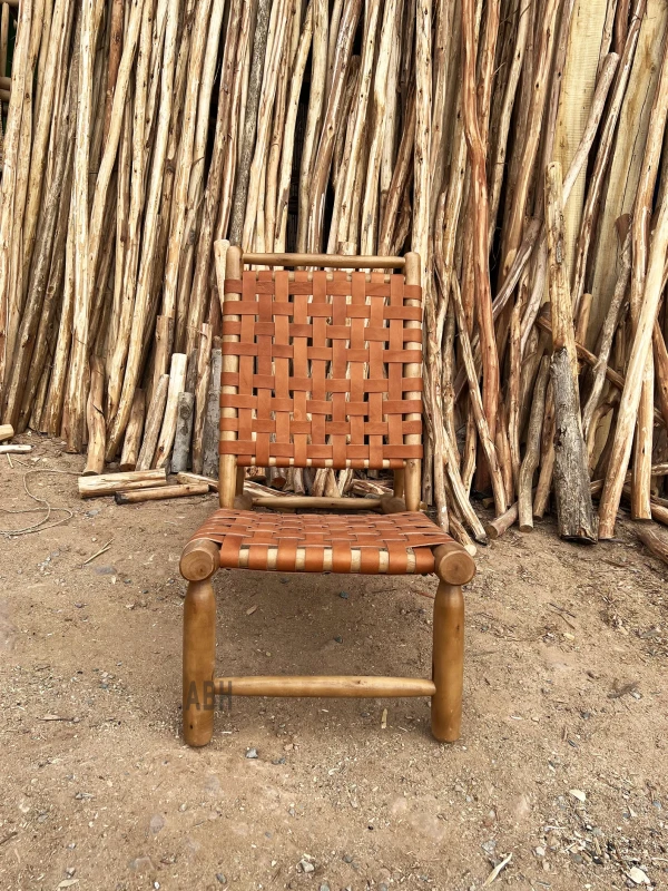 100% Handcrafted Moroccan armchair in laurel wood with natural leather seat, essential for a boho chic decoration. Entirely handmade in laurel wood by our craftsmen in Marrakech or to sit in the living room or simply decorative